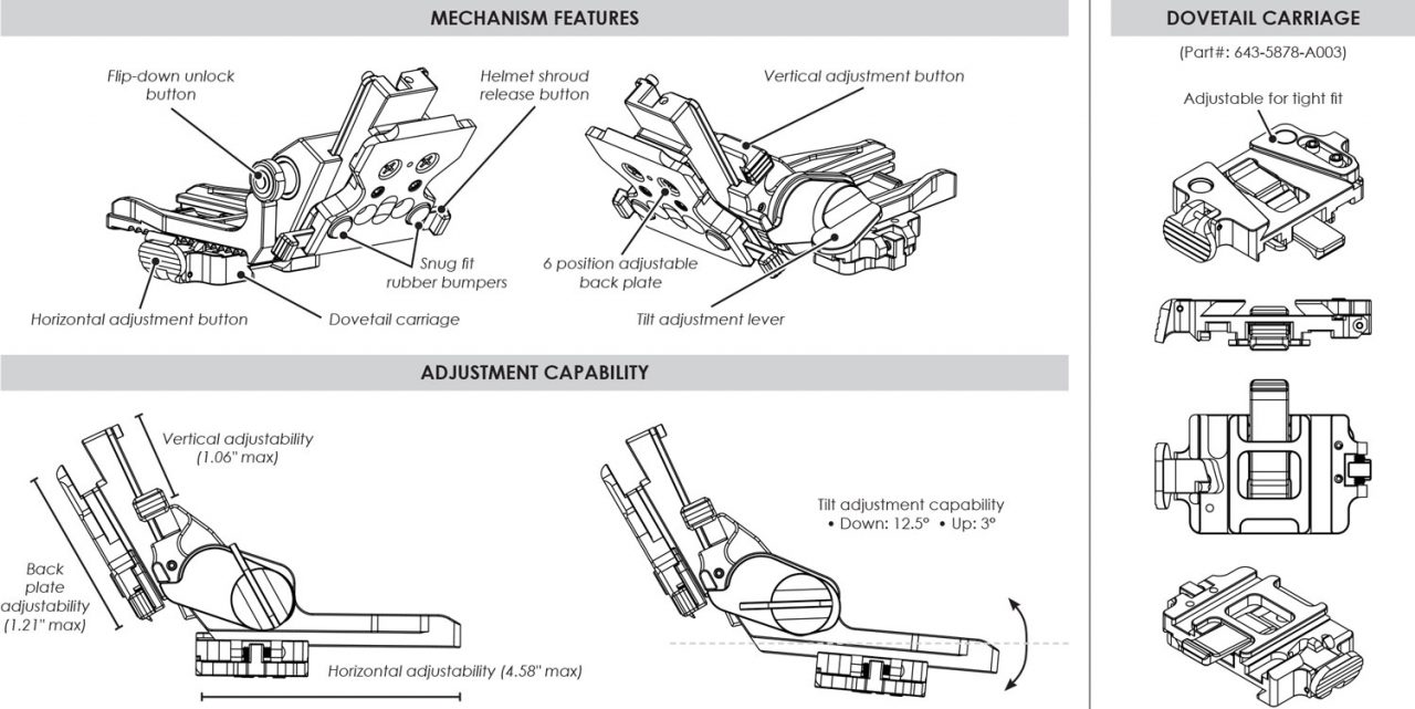 This Low Profile Flip-Up Mount (DOVETAIL) tactical mount enables easy, one-handed height adjustments and folds neatly along the helmet’s contour when stowed. Its six-position mounting plate fits various helmet systems and facial profiles. When impacted, it automatically flips up to protect both the NVG and the user. Moreover, this flip-up feature prevents damage to the optics and helps maintain situational awareness without compromising safety.