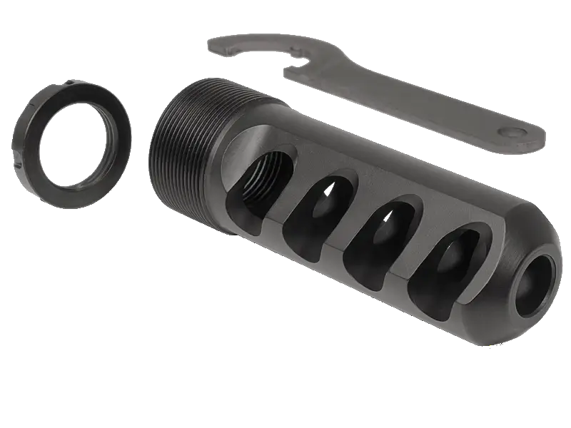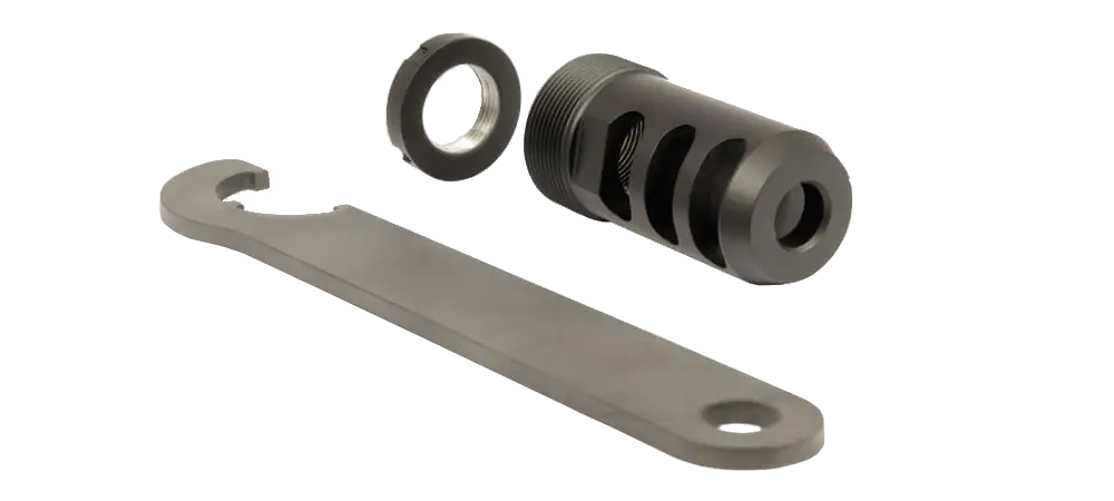 Le frein de bouche Cadex MX2-ST 50BMG Tactical est conçu pour s'adapter au suppresseur compact 50BMG. Le MX2-ST fixe le filetage de la bouche du canon et son contre-écrou à temporisation automatique arrête la rotation dans la position souhaitée à l'aide de la clé fournie. Le suppresseur compact 50BMG se visse sur le filetage extérieur du frein de bouche à 4 orifices, jusqu'à ce qu'il repose fermement sur l'extrémité conique du frein de bouche. Ceci permet un alignement parfait du suppresseur avec l'alésage et scelle les gaz brûlés.