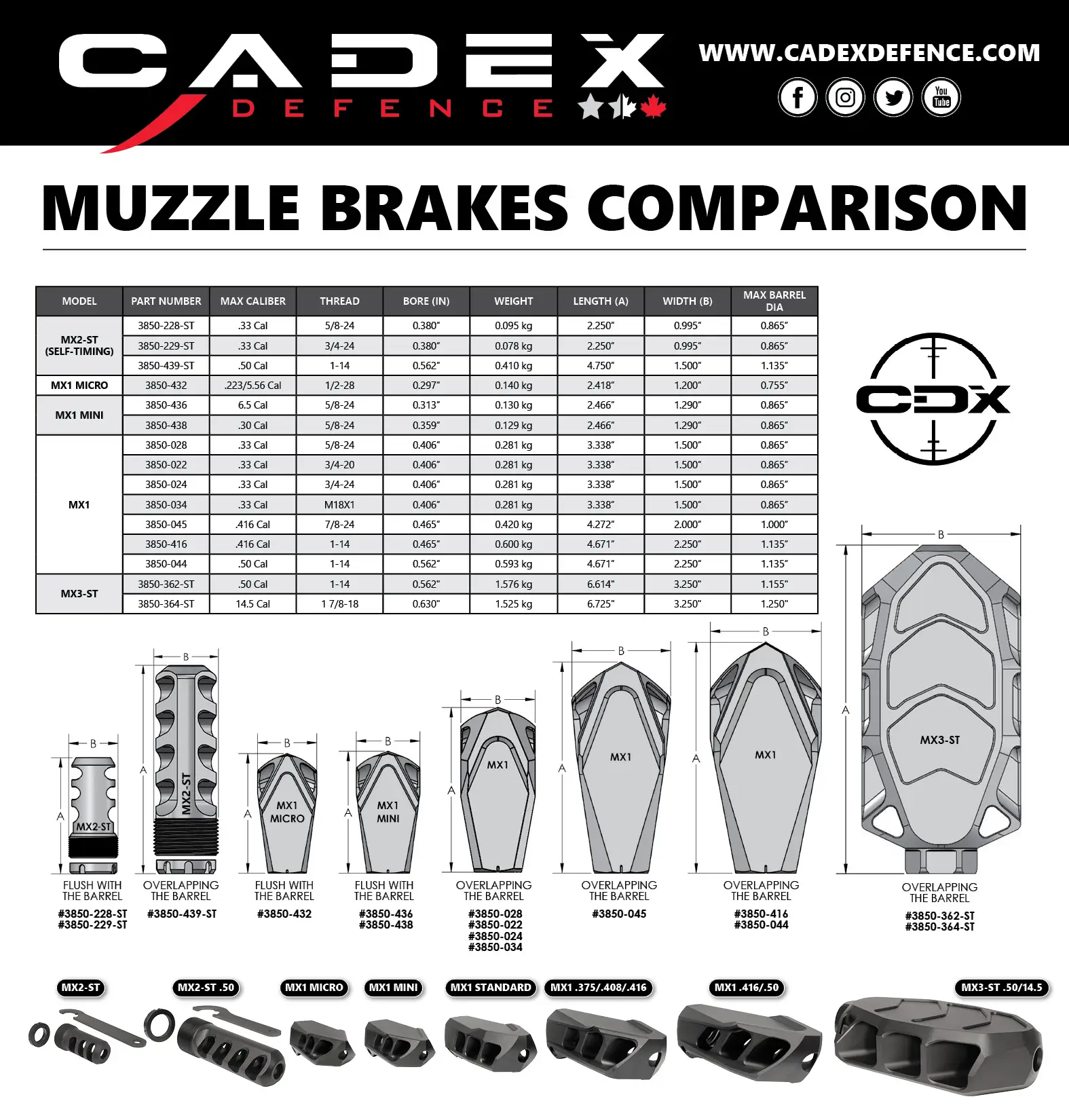 Le nouveau frein de bouche Cadex MX3 est indispensable pour les calibres extrêmement puissants comme le 50 BMG. Sa conception permet un flux d'air maximal à travers ses orifices massifs afin de dompter le recul des calibres les plus puissants.
