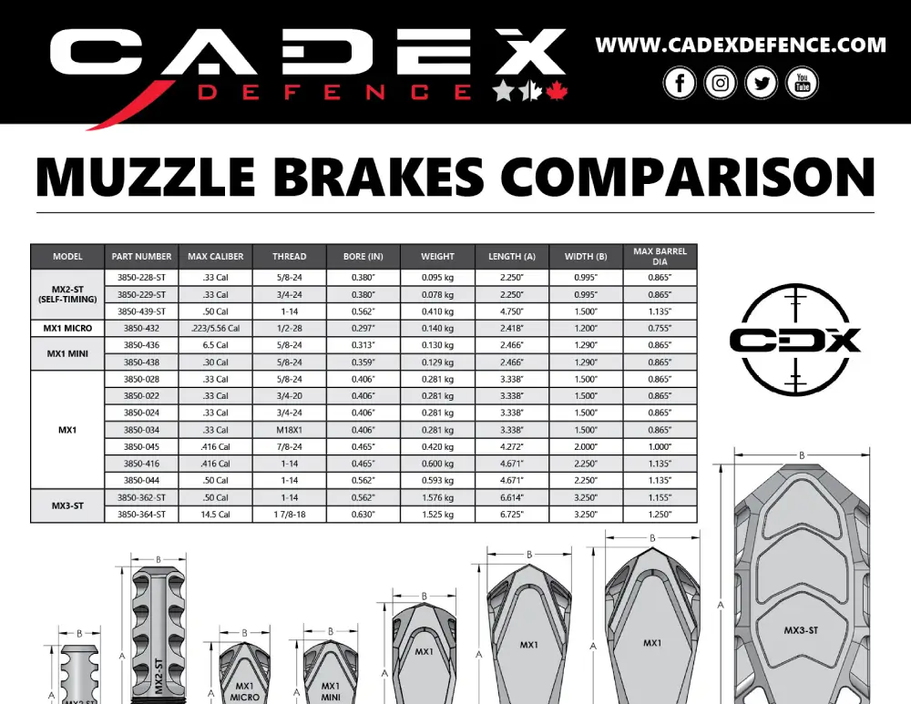 The new Cadex MX2 Self Timing Muzzle Brake design comes from the need to offer a muzzle brake small enough to fit inside a compact suppressor design. Cadex has moved away from crush washers in favor of a locking ring, allowing you to install and remove the MX2 with the included wrench quickly and easily. The end of the muzzle brake is tapered to perfectly align the compact suppressor. The MX2 Self Timing Muzzle Brake is lightweight while maintaining enough performance to control the muzzle jump on the rifle. Multiple bore sizes are available from .30 to .33. Comes standard on the CDX-R7 SHP Series rifles.